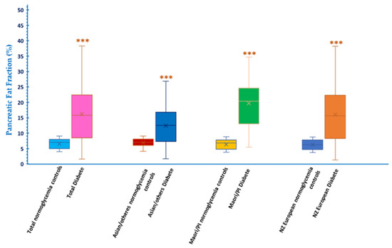 - Lê, K.-A.; Ventura, E.E.; Fisher, J.Q.; Davis, J.N.; Weigensberg, M.J.; Punyanitya, M.; Hu, H.H.; Nayak, K.S.; Goran, M.I. Ethnic Differences in Pancreatic Fat Accumulation and Its Relationship With Other Fat Depots and Inflammatory Markers. Diabetes Care 2011, 34, 485–490. [Google Scholar] [CrossRef] [PubMed]