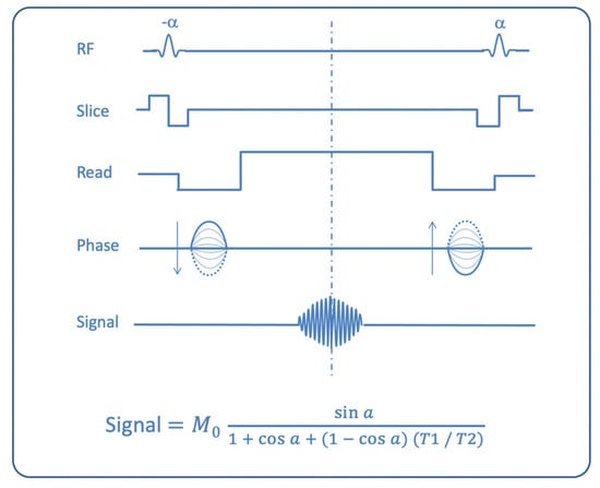 Scheme of a balanced Steady State Free Precession MR sequence, where balanced gradients along all three axes (slice-selection, phase-encoding, frequency-encoding) are used. In the formula (Huang et al., [5]), provided TR is much shorter than T1 and T2 of the tissue, it can be noted how signal intensity is directly related to the T2/T1 ratio at large flip angles. TR: repetition time; M0: magnetization at thermal equilibrium; α: flip angle.