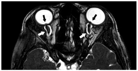 Axial three-dimensional constructive interference in steady-state (3D CISS) image showing in both sides posterior flattening of globes and protrusion of the optic nerve heads (black arrows), findings consistent with papilledema. Both optic nerves appear tortuous and the subarachnoid spaces surrounding them are enlarged (white arrows).