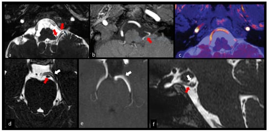 Neurovascular conflicts. (a–c) 71-year-old female with a 3-year history of intense pain localized in the pharynx and the posterior portion of the tongue. Axial 3D CISS (a) and 3D time-of-flight magnetic resonance angiography (3D TOF MRA) (b) show that the left posteroinferior cerebellar artery (red arrows) impacts the IX, X and XI cranial nerves at the root entry zone and along the intracisternal nerve tract. Postprocessed fused 3D CISS-TOF image (c) simultaneously displays the offending vessel (red color) and nerves (blue color). These images were released under CC license (with unrestricted use) (Alafaci et al. [25]). (d–f) Transient left third nerve palsy presumably caused by neurovascular compression. Axial (d) and sagittal (f) 3D CISS images show a close relationship between third nerve (red arrow) and posterior cerebral artery (white arrow) on the left side, with mild inferior displacement of the third nerve. 3D-TOF with maximum intensity projection (MIP) reconstructions (e) depicts the course of left posterior cerebral artery well. The patient spontaneously recovered from symptoms two days after the execution of magnetic resonance imaging (MRI).