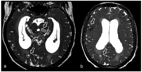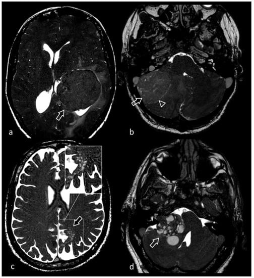 61-year-old male patient presenting with long-standing headache. MRI shows multiple supratentorial and infratentorial lesions, variable in size (some of the most prominent indicated by arrows), all characterized by marked blooming artifact in susceptibility weighted sequence (not shown). 3D CISS images (a,b) clearly show the composite structure of each lesion, made of multiple heterogeneous locules consistent with hemorrhage in different phases, surrounded by a hypointense rim due to hemosiderin. The most conspicuous lesion centered in midbrain tectum compresses the cerebral aqueduct, causing supratentorial hydrocephalus.