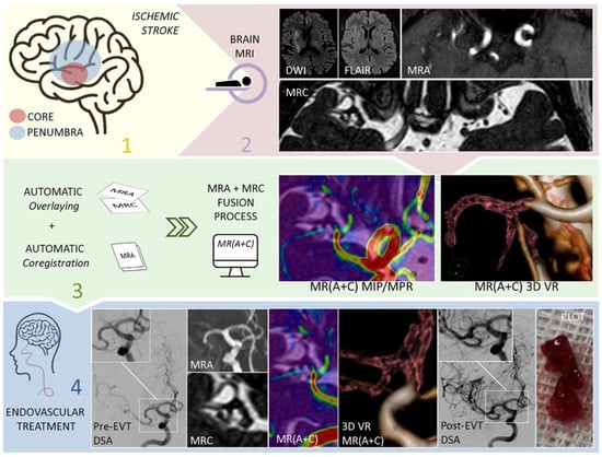 This figure shows the role that magnetic resonance cisternography (MRC) and magnetic resonance angiography (MRA), obtained with 3D CISS and 3D TOF, respectively, play in the diagnostic and therapeutic workflow in the setting of acute ischemic stroke (Mormina et al. [51,52]). This image was released under CC BY-NC-ND license (http://creativecommons.org/licenses/bync-nd/4.0/, accessed on 19 November 2022). 1 Clinical recognition of an acute ischemic stroke. 2 Brain MRI with the sequences diffusion-weighted imaging (DWI), fluid-attenuated inversion recovery (FLAIR), MRA and MRC. 3 Fusion process with the automatic overlaying and co-registration generates in a few seconds MR (A + C) fused images, with MIP, multiparametric (MPR) and volume-rendered (VR) reconstructions. 4 Endovascular treatment is performed on the patient affected by the acute ischemic stroke, with MR (A + C) serving as guidance.