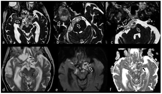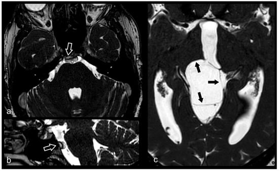 When used in 3D mode, the CISS sequence has numerous advantages, such as the strong hyperintensity of the CSF signal, high signal-to-noise (SNR) and contrast-to-noise (CNR) ratios, absence of artifacts from magnetic susceptibility, high spatial resolution, better anatomical details of small structures, and topographical definition between the lesion and anatomical structures [7,8,9,10]. In addition, multiplanar (MPR) reconstructions (axial, coronal and sagittal) and curvilinear reconstructions can be performed [9,11].