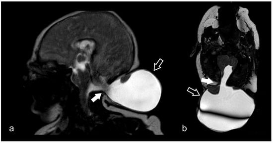 - Morioka, T.; Hashiguchi, K.; Samura, K.; Yoshida, F.; Miyagi, Y.; Yoshiura, T.; Suzuki, S.O.; Sasaki, T. Detailed anatomy of intracranial venous anomalies associated with atretic parietal cephaloceles revealed by high-resolution 3D-CISS and high-field T2-weighted reversed MR images. Child’s Nerv. Syst. 2009, 25, 309–315. [Google Scholar] [CrossRef]
