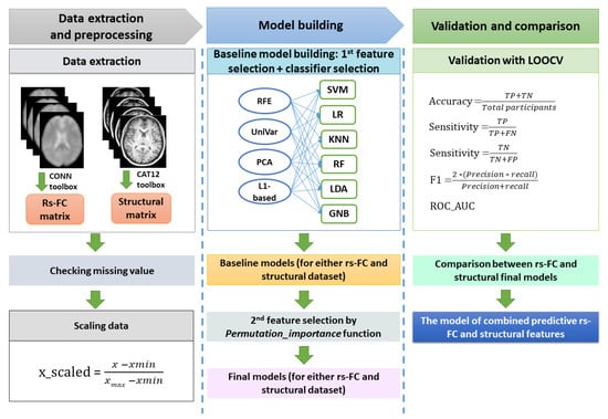 It should be noted that both rs-FC and structural MRI data extracted from participants are high-dimensional, which includes noise and could induce overfitting for classification results [14]. Therefore, the feature selection was performed for those datasets. When building the baseline ML models in this study, several common feature selection methods were used, including recursive feature elimination (RFE), univariate feature selection, principal component analysis (PCA), and the L1-based selection method [33].
