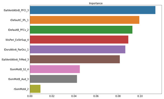 The important feature ranking in the baseline model of structural data. Note: lSalVentAttnB_PFCI_3 = the lateral prefrontal cortex regions of the left salience ventral attention network B; rDefaultC_IPL_1 = the right inferior parietal lobule node 1 of the default mode network C; lDefaultB_PFCv_2 = the ventral prefrontal cortex node 2 of the left default mode network; MisPeri_ExStrSup_4 = extra-striate superior node 4; lDorsAttnA_ParOcc_1 = parietal occipital node 1 of the left dorsal attention network A; lSalVentAttnA_FrMed_3 = the medial frontal node of the left salience ventral attention network A; lSomMotB_S2_4 = the S2 node 4 of the left sensorimotor network B; lSomMotB_Aud_3 = the auditory node 3 of sensorimotor network B; rSomMotA_2 = the right sensorimotor network A node 2.