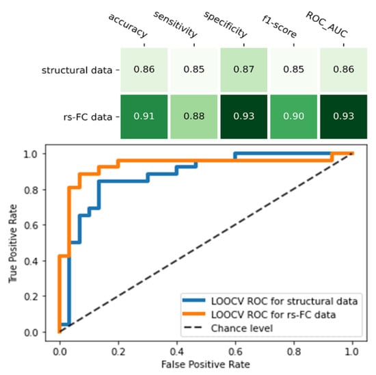 We performed the ML model using both predictive FC and structural features from the final ML models of FC and structural data (Table S3). The combined model with SVM or LR showed the same performance, with accuracy: 0.95, sensitivity: 0.96, specificity: 0.93, f1-score: 0.95, and ROC_AUC score: 0.95 (p-value = 9.9 × 10−4). Compared to the final ML model of rs-FC features only, the model of combined functional and structural features showed higher in all indicators, except specificity.