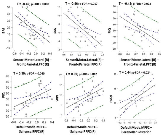 Among nine rs-FC features in the final ML model of rs-FC data, the rs-FC between the right sensorimotor network and prefrontal parietal cortex was negatively correlated with BAI, SSS, and FIQ scores (τ = −0.49, −0.46, and −0.43 with p-FDR = 0.008, 0.017, and 0.023, respectively). In contrast, the rs-FC between the medial prefrontal cortex (default mode network) and the right rostral prefrontal cortex (salience network) was positively correlated with FIQ and WPI scores (Kendall’s Tau τ = 0.39 and 0.39 with p-FDR = 0.040 and 0.042, respectively). The rs-FC between the medial prefrontal cortex (default mode network) and the posterior cerebellar region (cerebellar network) was positively correlated with the PSQI score (τ = 0.44; p-FDR = 0.024) (Figure 5, Table S4). A significant correlation between structural features and clinical data was not found in this study (Table S5).