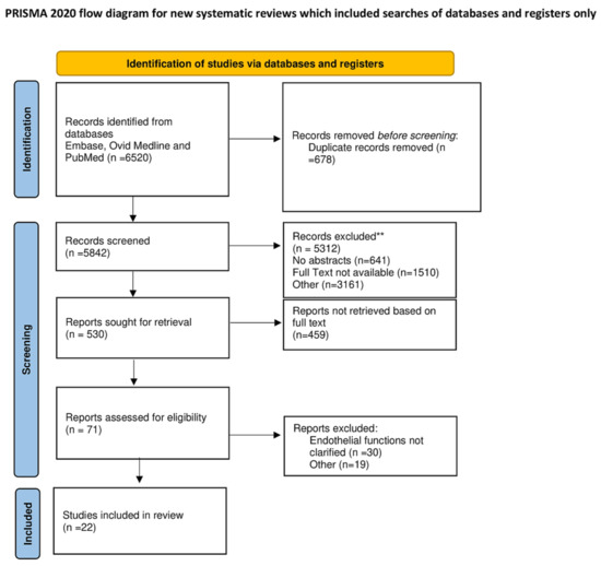 For the present analysis, the largest contemporary studies reporting the role of the endothelium in coronary microvascular diseases were included. Moreover, RCTs targeting endothelial function and coronary microvascular function were considered. Studies were stratified based on the endothelial modulation of vascular tone and coronary microvascular disease, both as regards the pathophysiological aspect and with regard to the most recent therapeutic approaches. The review was registered with the OSF register of systematic reviews (registration no is h5t2q) and followed the Preferred Reporting Items for Systematic Reviews and Meta-analyses (PRISMA) reporting guidelines. (Figure 1). Prisma check list in Supplementary Material. The project has been registered https://osf.io/h5t2q/?view_only=299975a535d64d83ad369baa1fb733e0 (accessed on 31 October 2022).