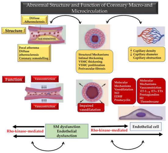 In the last two decades, numerous publications have identified the pathogenetic mechanisms of endothelial dysfunction and anomalies of coronary vasomotor function and how they have a significant impact on cardiovascular disease [1,2,3,4,5,6,7,8,9,10]. In cardiac architecture, the coronary compartment with its circulatory function plays a key role in ensuring integrity in the role of a muscle pump through the maintenance of adequate coronary vasomotion. Disorders involving coronary vasomotion may be characterized by greater coronary vasoconstrictive reactivity at the epicardial and microvascular levels. Similarly, the impairment of endothelium-dependent and endothelium-independent coronary vasodilator capacity takes on crucial pathological significance, as does the enhancement of coronary vasodilatory potential related to changes in microvascular resistance caused by structural factors [1,2,3,4,5]. Several studies reported the role of endothelial dysfunction which has been substantially associated with the development and progression of macrovascular and microvascular coronary disease. However strong evidence suggests that Rho-kinase-induced myosin light chain phosphorylation leads to hypercontraction of vascular smooth muscle cells (VSMC) rather than endothelial dysfunction [1,2] as the former is the central mechanism of coronary spasm at epicardial and microvascular levels [6,7,8,9,10].