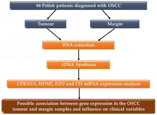 The study group consisted of 88 Polish patients diagnosed with OSCC. The tumour and matching margin specimens were collected following surgical resection at the Department of Otorhinolaryngology and Oncological Laryngology, Faculty of Medical Sciences in Zabrze, Medical University of Silesia in Katowice, Poland and the Maria Sklodowska-Curie National Research Institute of Oncology (formerly known as the Maria Sklodowska-Curie Memorial Cancer Centre and Institute of Oncology), Gliwice, Poland. Tumour staging was based on the American Joint Committee on Cancer (AJCC, version 2007) [11,12] and WHO Classification of Head and Neck Tumours [13]. Margins were verified as being free of cancer by pathologists. All samples after resection were immediately submerged in stabilization solution, RNAlater® (Sigma-Aldrich, Saint Louis, MO, USA), then frozen at −80 °C until RNA extraction. The main inclusion criteria for the OSCC group included a diagnosis of primary tumours and no history of preoperative radio- or chemotherapy. The study was approved by the Bioethics Committee of the Medical University of Silesia (approval no. KNW/022/KB1/49/16 and no. KNW/002/KB1/49/II/16/17) and the Institutional Review Board on Medical Ethics of the Maria Sklodowska-Curie Memorial Cancer Centre and Institute of Oncology in Gliwice (approval no. KB/493-15/08 and no. KB/430-47/13). The study protocol diagram is shown in Figure 1.