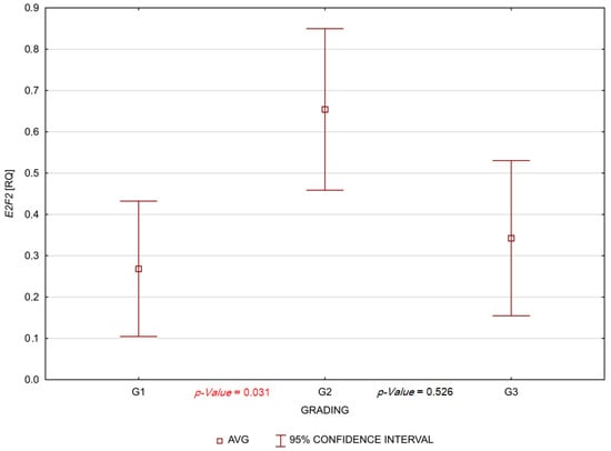 No association was found between the gene expression levels, age, gender, smoking, alcohol consumption and clinical parameters (TNM and G) in tumour and margin samples, except E2F2. The patients with G2 (moderately differentiated) tumours had a significantly higher gene expression level of E2F2 than patients with low-grade G1 (well-differentiated) tumours (p-Value = 0.031) in tumour samples. These results are shown in Figure 2.