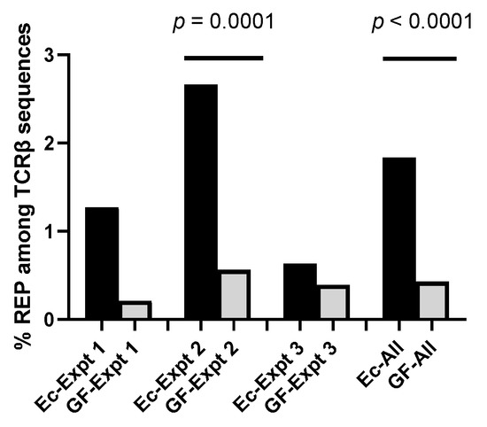 Percentages of REP sequences among all unique TCRβ sequences in Ec and GF mice. Percentages are shown for the numbers of REP sequences in Ec and GF mice in three independent experiments examined individually and together (All). There were 2 Ec and 2 GF mice in experiment 1, 4 Ec and 4 GF mice in experiment 2, and 2 Ec and 4 GF mice in experiment 3. In each experiment, REP frequencies were higher in Ec mice compared to GF mice. REP frequencies were significantly different between mouse groups in experiment 2 (the largest experiment), and in sequences from combined experiments. Fishers Exact tests were used.