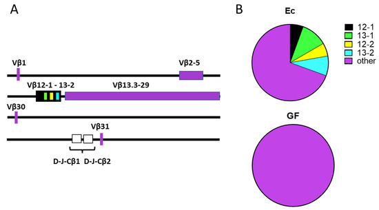 TCR Vβ 12-13 usage among REP sequences in Ec and GF mice. (A) Vβ gene positions in the murine TCRβ loci. Maps were based on information from the IMGT website [3]. Vβ genes in the 12-13 cluster are color-coded (black, green, yellow, blue) and the remaining genes are shown in purple. Dβ, Jβ, and Cβ genes are shown in white. (B) The frequencies of Vβ 12-13 sequences within REP sequences among Ec (n = 36 total sequences) and GF (n = 11 total sequences) mice are shown with color-coding. ‘Other’ refers to all REP Vβ sequences outside of the 12-13 cluster (purple).