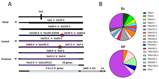 TCR distal Vα usage among REP sequences in Ec and GF mice. (A) Relative gene fragment positions are shown. Maps were based on information from the IMGT website [3]. Three sections of genes (distal, central, proximal) are separated by red stars. Distal Vα gene positions are shown in black, while central and proximal gene positions are shown in purple. TCR δ genes and Jα/Cα genes are shown in white (B) Distal Vα sequence usage among REP sequences in Ec and GF mice from the three combined experiments are shown. There were 26 TCRα REP sequences in Ec mice and 18 TCRα REP sequences in GF mice. Distal Vα sequences are named and color-coded. Central and proximal sequences are termed ‘other’ and shown in purple. Analyses of all REP sequences from the three experiments combined showed significantly more distal Vα usage in Ec mice compared to GF mice among REPs (p = 0.032). When unique TCR Vα sequences were examined, there was again a significantly higher frequency of distal Vα sequences in Ec mice compared to GF mice. The two largest of the three experiments (experiments 2 and 3) exhibited significant differences when analyzed independently (p = 0.02 for each). The heightened distal Vα usage in Ec mice compared to GF mice was most apparent when sequences from the three independent experiments were combined (n > 1900, p = 0.009).