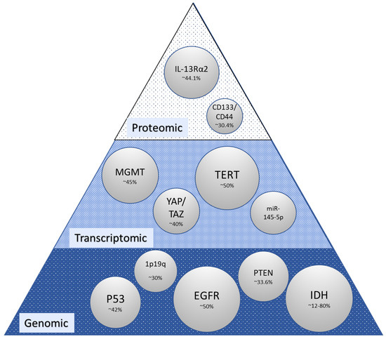 | Asif et al., 2019 [27] | Comparative proteogenomic characterization of glioblastoma | Significantly mutated genes in GBM included TP53, EGFR, PIK3R1, PTEN, NF1, RET, and STAG2. MGMT methylation was present in two-thirds of cases. |