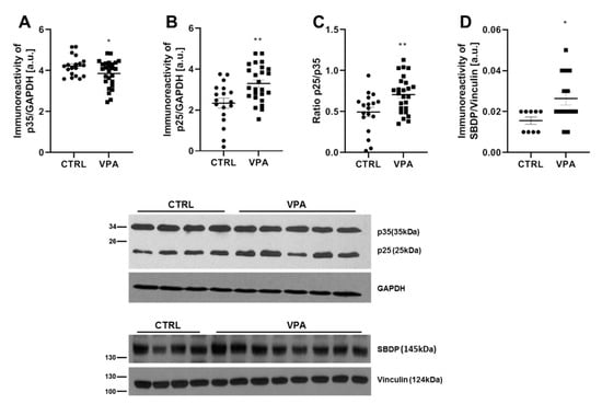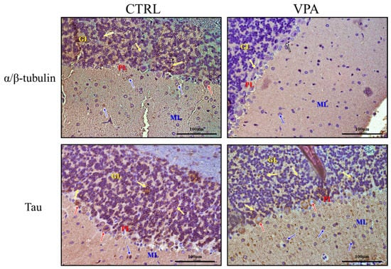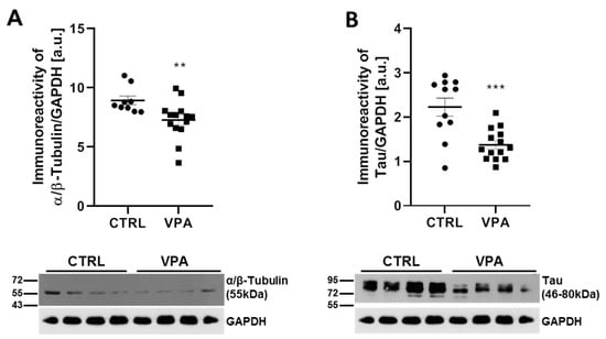 3.1. Prenatal Exposure to VPA Induces Changes in the Level of α/β-Tubulin and MAP-Tau in the Cerebellum of Adolescent Rat Offspring