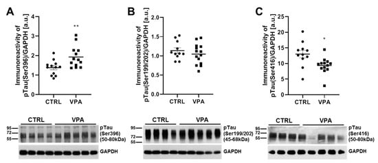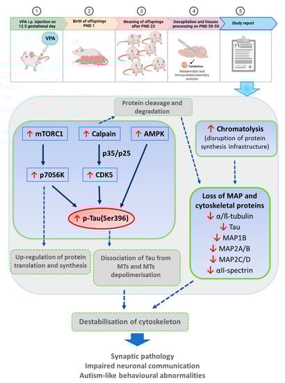 - Gąssowska-Dobrowolska, M.; Kolasa-Wołosiuk, A.; Cieślik, M.; Dominiak, A.; Friedland, K.; Adamczyk, A. Alterations in Tau Protein Level and Phosphorylation State in the Brain of the Autistic-Like Rats Induced by Prenatal Exposure to Valproic Acid. Int. J. Mol. Sci. 2021, 22, 3209. [Google Scholar] [CrossRef]