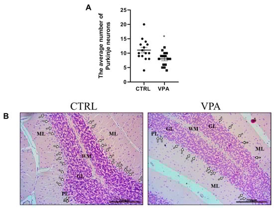 3.6. Prenatal Exposure to VPA Induces Loss of Purkinje Cells along with Histopathological Changes in the Neurons