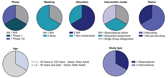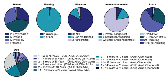 Detailed analysis of the CAR-NK clinical landscape. Pie charts with categorisation of CAR-NK clinical trials by status and study design as indicated (phase, masking, allocation, intervention model assignment, status and age). All current CAR-NK trials are interventional.