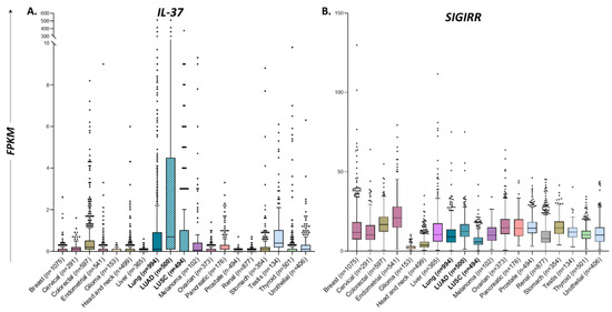 Box and Tukey whiskers diagrams showing the differential distribution of IL-37 (A) and SIGIRR (B) expression levels (FPKMs), as analyzed by RNA sequencing in human tumor samples of various cancer types. Especially for lung cancer, samples were separately analyzed as lung adenocarcinoma (LUAD) or squamous carcinoma (LUSC). Data were obtained from www.proteinatlas.org [31] (accessed on 24 August 2022) and further processed for statistical analysis. Left and right sides of the boxes correspond to the lower and upper quartiles; the box covers the interquartile interval including 50% of the data. The vertical line in the box represents the median. Whiskers outside the box expand from the minimum to the lower quartile and from the upper quartile to the maximum of data range. Each dot represents the value of a single sample.