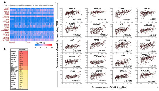 (A) Heatmap depicting the relative expression levels (log2TPM + 1) of IL-37 and twenty IL-37-correlated genes in normal and LUAD biopsies as analyzed by RNAseq. (B) Dot plot diagrams showing the correlation between IL-37 and each of the twenty significantly positively correlated genes. No negative associations were detected. Pearson’s r values are reported in each case. All p-values were <0.0001. Figures were exported from http://ualcan.path.uab.edu/ [33] (accessed on 10 September 2022). (C) Heatmap depicting the grade of association between the expression levels of each of the twenty IL-37-positively correlated genes and the levels of IL-37. Pearson’s r values are reported.