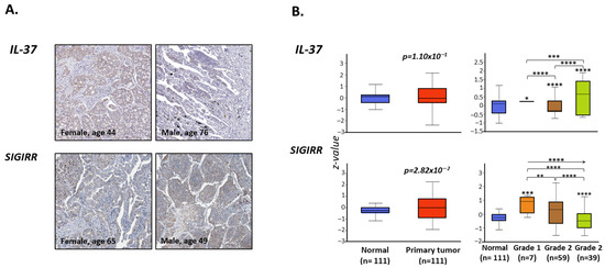 (A) Immunohistochemical staining of IL-37 and SIGIRR proteins in lung biopsies of LUAD patients. Pictures were obtained from www.proteinatlas.org [35] (accessed on 20 September 2022). (B) Box and Tukey whiskers diagrams depicting the differential protein expression levels of IL-37 and SIGIRR (z-values) in LUAD primary tumors (n = 111) vs. normal tissues (n = 111) and among LUAD tumors of different grade (1 to 3). Figures and graphs were exported from http://ualcan.path.uab.edu/ [33] (accessed on 20 September 2022). *: p < 0.05, **: p < 0.01, ***: p < 0.001, ****: p < 0.0001.