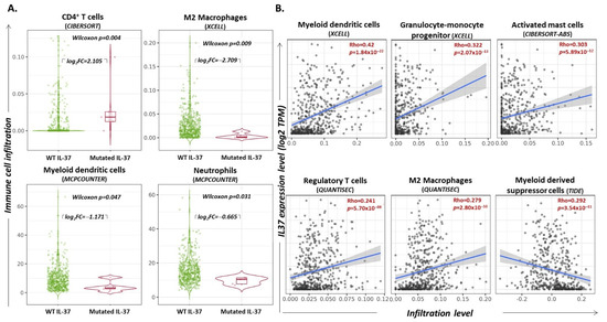 (A) Violin plots depicting the distribution of infiltrated T cells, M2 macrophages, myeloid dendritic cells, and neutrophils in LUAD tumors without versus with mutation on IL-37. Wilcoxon p-values and log2 (fold-changes, FC) are reported. (Β) Scatter plot diagrams depicting the linear association between levels of IL-37 gene expression (log2TPM; y-axis) and infiltration of the tumor by certain cell subsets (x-axis). Spearman’s Rho and p-values are reported. Data were filtered for tumor purity. Graphs were exported from http://timer.cistrome.org/ [36] (accessed on 1 October 2022).