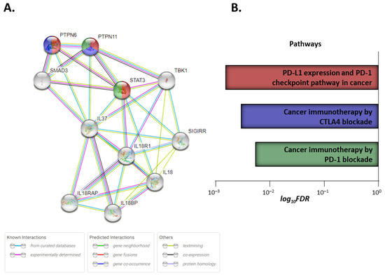 Finally, analysis using the STRING database [37] processing data from the various depositories revealed that protein molecules involved in the IL-37 signaling pathway are also members of cancer-related pathways (Figure 6). Specifically, STAT3 is involved in “PD-L1 expression and PD-1 checkpoint pathway in cancer” (KEGG database) and “Cancer immunotherapy by PD-1 blockade” (WikiPathways), PTPN6 in “PD-L1 expression and PD-1 checkpoint pathway in cancer” (KEGG database)/“PD-1 signaling” (Reactome), and “Cancer immunotherapy by CTLA4 blockade” (WikiPathways), and PTPN11 is involved in all of the above. False discovery rates of the significance for each of the enhanced pathways are: 0.0015 for PD-L1 expression and PD-1 checkpoint pathway in cancer, 0.0029 for cancer immunotherapy by CTLA4 blockade, 0.0053 for cancer immunotherapy by PD-1 blockade, and 0.0081 for PD-1 signaling.