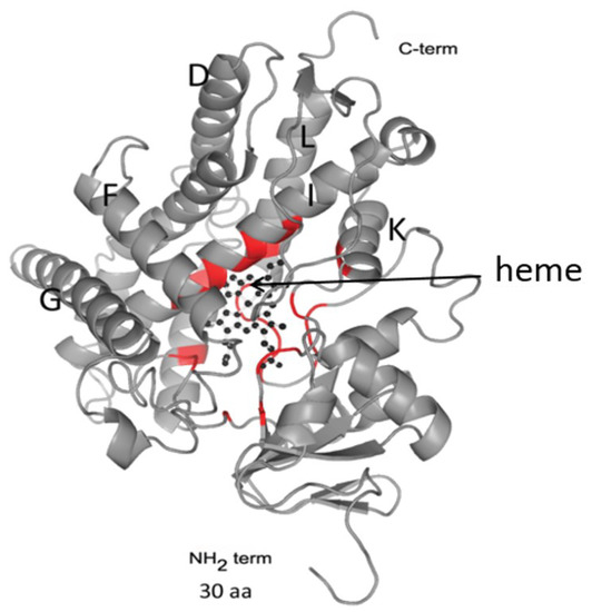 A 3D structure modeling of OfCYP (Phyre2). The arrow indicates the position of the heme within the globular region of the protein. Regions of the protein taking part in heme positioning are highlighted in red.