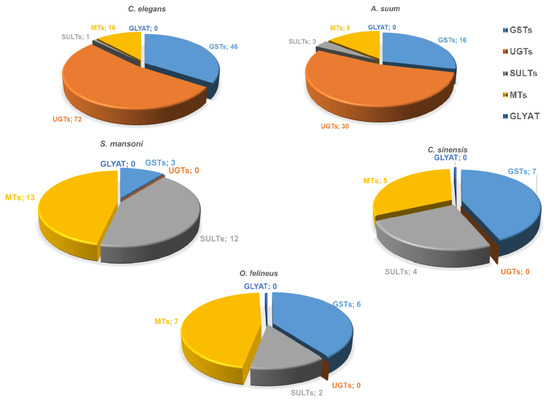 In addition, we did not find any arylamine N-acetyltransferases (PF00797) [14], which are also common phase II xenobiotic metabolism enzymes in vertebrates. Thus, detoxification phase II of parasitic flatworms has essential specific structural and functional features distinguishing it from the corresponding systems in other organisms, including the host system performing metabolism of exogenous substrates (Figure 3). As for methyltransferases, genes encoding these enzymes are present in both trematode and nematode genomes; e.g., 8 genes have been identified in A. suum and 16 genes in C. elegans, while 5–7 genes have been identified in opisthorchiids and 13 in S. mansoni (Figure 3). The genes encoding sulfotransferases are present in both trematode (5–13 genes) and nematode genomes (1–2 genes) (Figure 3). It is noteworthy that no glycine-N-acyltransferase (GLYAT) genes have been found in either flatworms or roundworms.