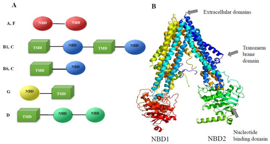Although there are differences in their function and types of substrates, they share high structural homology. Human P-glycoprotein (ABCB1), which is encoded by the MDR1 gene, is the best-known and best-studied ABC transporter among human ABC proteins. ABCB1 was discovered in 1976 [30] because of its involvement in the multidrug resistance of cancer cells to chemotherapy, which is how it got its name (multidrug resistance gene, MDR). The protein is made up of two parts that share high similarity. Each homologous region contains six hydrophobic transmembrane domains and a hydrophilic intracellular region encoding an adenosine triphosphate (ATP)-binding site (nucleotide-binding domain, NBD).