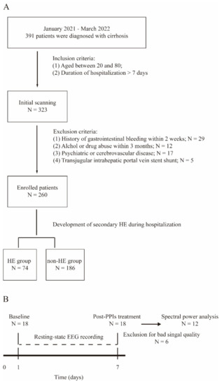 Functional magnetic resonance imaging may provide morphological evidence as one potential bio-marker for exploring the neural correlates of cognitive deficits [9]. However, the great cost and complicated data processing may hinder clinical applications. Alternatively, the electroencephalogram is relatively easy to perform for the diagnosis of the neurological disease, including epilepsy, autism spectrum disorder, and Alzheimer’s disease [10,11]. Furthermore, emerging evidence has supported the diagnostic value of quantitative EEGs in terms of survival and the risk of developing overt HE [12,13]. However, the relationship between the cortical dynamics and HE development during PPIs management remains uncertain. In this study, we initially reviewed the medical data of 260 cirrhosis patients to confirm the role of PPIs in the development of secondary HE in hospitalized patients. Next, we aimed to investigate the potential cortical signature of HE candidates who received PPI treatment.