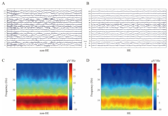 Comparison of EEG signal between non-HE and HE patients who received PPIs treatment. (A) Representative resting-state EEG traces in non-HE cohort, and (B) one with HE, respectively. (C,D) Comparison of spectrogram at distinct neurological condition (non-HE versus. HE).