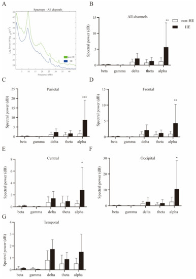Reduction of alpha oscillations in the HE patients treated with PPIs. (A) Grand average spectral power was compared between non-HE and HE patients, (B) significant reduced alpha neural oscillation was associated with the HE development in cirrhosis patients under PPIs therapy. (C–F) Suppression of cortical alpha activity was detected in the parietal, frontal, central, and occipital, but NOT in the temporal region (G). A repeated-measures two-way ANOVA with post hoc Bonferroni tests. * p < 0.05, ** p < 0.01, *** p < 0.001.
