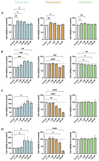 Figure 1. Effects of edaravone, perampanel, and metformin on the viability of HT-22 cells, at different time points of exposure. (A) 6-h treatment; (B) 24-h treatment; (C) 48-h treatment; (D) 72-h treatment. Cell viability was assessed by using the MTT assay. Results are expressed as the percentage of cell viability relative to the respective untreated control cells. *, **, ***, and **** indicate p < 0.05, p < 0.01, p < 0.001, and p < 0.0001, respectively, when compared to control. All data are presented as the mean + SEM of three independent experiments.