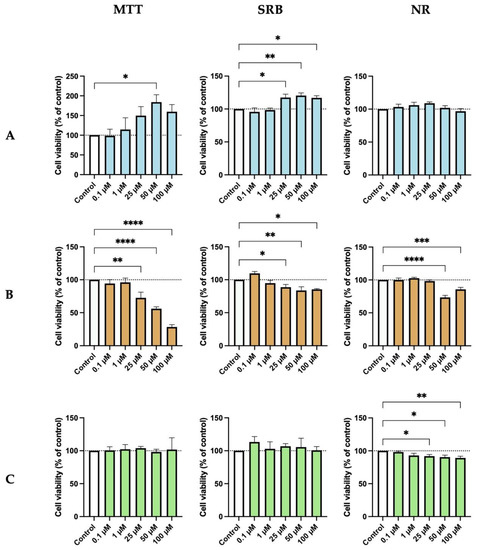 At the end of the incubation periods, cellular viability was assessed using MTT, SRB, and NR assays. For the MTT assay, the cell medium was removed, and 100 µL of MTT solution (0.5 mg/mL in PBS) was added to each well, followed by 3 h of incubation protected from light. Then, the solution was aspirated and DMSO (100 µL/well) was added to solubilize formazan crystals. Absorbance was then measured at 570 nm, using an automated microplate reader (Tecan Infinite M200, Tecan Group Ltd., Männedorf, Switzerland). To perform the SRB protocol, the cell medium was removed, and cells were firstly washed with PBS solution. After that, cells were fixed with 10% cold trichloroacetic acid for 30 min and subsequently stained, protected from light, with 200 µL/well of SRB for 1 h. Afterwards, the plate was washed with tap water several times to remove excess dye. Finally, the dye bound to the proteins was dissolved with Tris-NaOH solution (10 mM). Absorbance was measured using a microplate reader with a wavelength of 540 nm (Tecan Infinite M200, Tecan Group Ltd., Männedorf, Switzerland). For the NR assay, 100 µL of the NR medium (1:100 in culture medium) was added to each well after the cell medium removal. After 3 h of incubation, cells were washed with 150 µL of PBS, and 150 µL of NR destain solution was added to each well. Afterward, absorbance at 540 nm was measured by using the microplate reader (Tecan Infinite M200, Tecan Group Ltd., Männedorf, Switzerland).