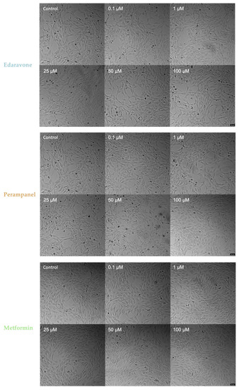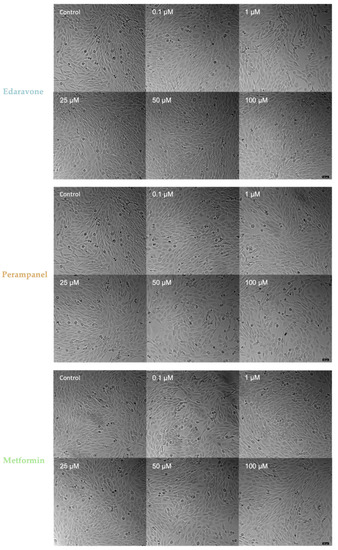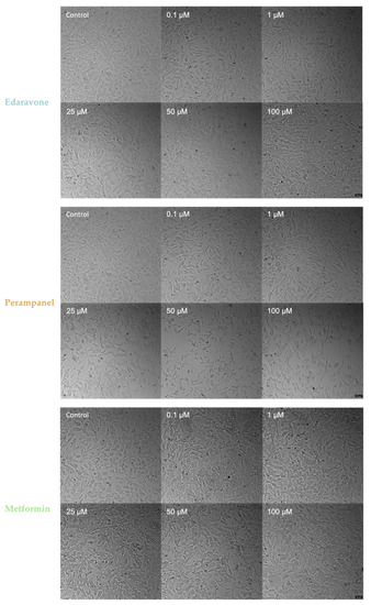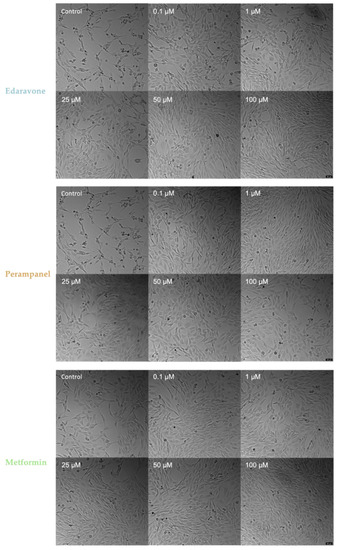 Figure 5. Microscopic representative images of SH-SY5Y control cells and SH-SY5Y cells exposed for 48 h to concentrations, ranging from 0.1 to 100 µM, of edaravone, perampanel, and metformin. Images of cell morphology were obtained using a Leica microscope equipped with Leica LAS X imaging software v3.7.4 (Leica Microsystems, Wetzlar, Germany) from three independent experiments. Scale bar: 50 µm.