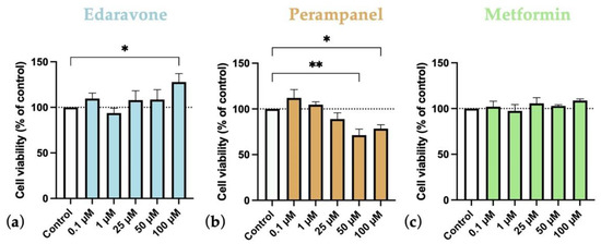 Figure 4. Effects of (a) Edaravone, (b) Perampanel, and (c) Metformin treatment for 48 h on SH-SY5Y cells viability. Cell viability was assessed by MTT assay. Results are expressed as the percentage of cell viability relative to the respective untreated control cells. * and ** indicate p < 0.05 and p < 0.01, respectively, when compared to control. All data are presented as the mean + SEM of three independent experiments.