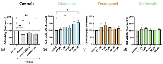 Figure 6. Effects of hypoxia, and edaravone, perampanel, and metformin treatments on HT-22 cells viability. Hypoxia and drugs were applied simultaneously for 48 h. (a) Controls graph, comparing controls/vehicles under hypoxic conditions to normoxia ones. (b) Edaravone, (c) Perampanel, and (d) Metformin treatments, while under hypoxia. Cell viability was evaluated by using the MTT assay. Results are expressed as the percentage of cell viability relative to respective untreated hypoxia control cells. * and ** indicate p < 0.05 and p < 0.01, respectively, when compared to the respective control under hypoxia conditions. All data are presented as the mean + SEM of three independent experiments.