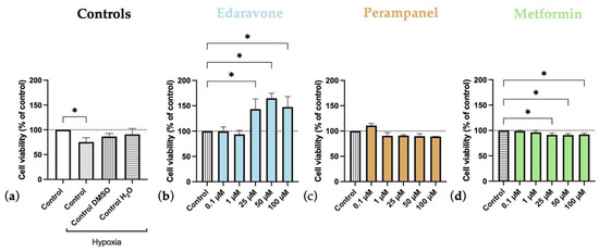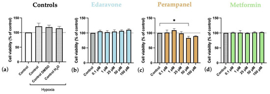 Figure 7. Effects of 24 h of hypoxia followed by 24-h exposure to edaravone, perampanel, and metformin on HT-22 cells viability. (a) Controls graph, comparing controls/vehicles in hypoxic conditions to normoxia ones. (b) Edaravone, (c) Perampanel, and (d) Metformin treatments, after 24 h under hypoxia. Cell viability was assessed by MTT assay. Results are expressed as the percentage of cell viability relative to the respective untreated hypoxia control cells in (bd). * p < 0.05 when compared to hypoxia control. All data are presented as the mean + SEM of three independent experiments.