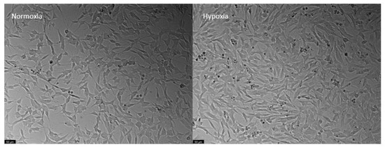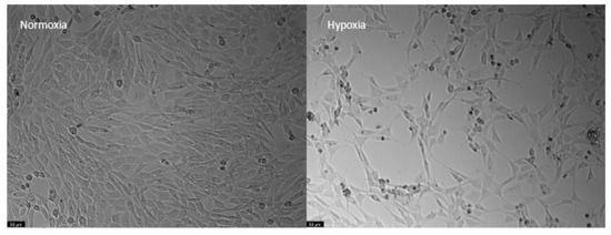 Moreover, after 48 h of hypoxia, it was clearly visible that there were both morphological and cell density differences between cells in normoxia and hypoxia. Specifically, the cell density was lower in those submitted to hypoxia, and these cells displayed a more rounded shape (Figure 8).