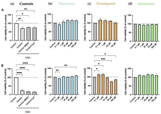 Figure 12. Effects of oxygen–glucose deprivation (OGD) and edaravone, perampanel, and metformin treatments for 6 (A) and 48 (B) hours on HT-22 cells viability. (a) Controls graph, comparing controls/vehicles in OGD conditions to standard medium. (b) Edaravone, (c) Perampanel, and (d) Metformin treatments, while in OGD conditions. Cell viability was assessed by MTT assay. Results are expressed as the percentage of cell viability relative to untreated control cells submitted to OGD. *, **, *** and **** indicate p < 0.05, p < 0.01, and p < 0.001, respectively, when compared to the respective control. All data are presented as the mean + SEM of three independent experiments.
