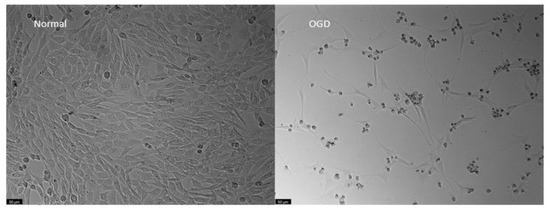 The morphology of cells submitted to OGD was altered. Cells showed a smaller and more rounded shape, with longer prolongations than controls. Their density was also clearly reduced (Figure 13).