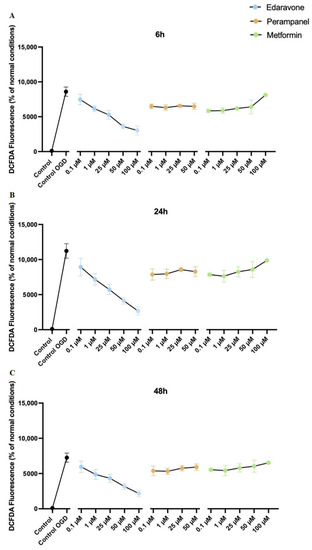 Figure 16. Protective efficacy of edaravone, perampanel, and metformin in HT-22 cells exposed to oxygen–glucose deprivation (OGD) over 6 (A), 24 (B), and 48 (C) hours. DCFDA fluorescence (dye of ROS generation) change percentage (%) of the different concentrations of edaravone, perampanel, and metformin, exposed to OGD. Results are expressed as the percentage of DCFDA fluorescence relative to control cells, in normal conditions. Results were assessed by fluorescence plate reader (SpectraMax Gemini EM Microplate Reader, Molecular Devices, San Jose, California), 485 nm excitation and 530 nm emission. Data are presented as the mean ± SEM of three independent experiments.
