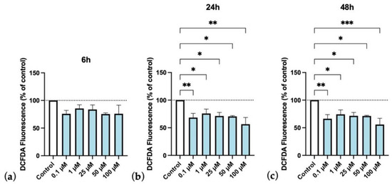 Figure 17. Protective efficacy of edaravone on HT-22 cells exposed to oxygen–glucose deprivation (OGD), over time (6, 24, and 48 h, (a), (b), and (c), respectively). DCFDA fluorescence (dye of ROS generation) change percentage (%) of the different concentrations of edaravone exposed to OGD conditions over control. Results are expressed as the percentage of DCFDA fluorescence relative to untreated control cells in OGD. Results were assessed by fluorescence plate reader (SpectraMax Gemini EM Microplate Reader, Molecular Devices, San Jose, California), 485 nm excitation and 530 nm emission. All data are presented as the mean + SEM. *, **, and *** indicate p < 0.05, p < 0.01, p < 0.001, respectively, when compared to control.