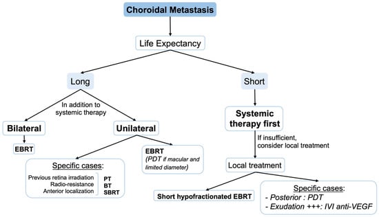 20]. However, little is known about the efficacy of targeted therapy or immunotherapy on choroidal metastasis. Overall, a concomitant local treatment could be proposed initially or shortly after systemic therapy to ensure a long-term response. The choice of technique depends on several factors including the number of ocular metastases, their localization, visual prognosis, and life expectancy.