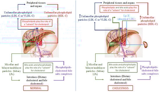 In addition to cholesterol and PhLs (mainly phosphatidylcholines and lecithins), bile acids, the end product of cholesterol catabolism, are present in bile. Bile acids, such as PhLs, are amphiphilic compounds and can also form micellar and lamellar structures in an aqueous medium and serve as a solvent for cholesterol. As a consequence, PhLs and bile acids in bile form micellar and lamellar structures that solubilize cholesterol onto themselves (Figure 2). The degree of cholesterol solubility in bile is determined by the ratio of cholesterol/PhLs/bile acids. In addition to PhLs, bile acids present in these particles give rise to PhL bilayer/multilayer particles [36,37] that in native bile represent bile LPs [37]. The total concentration of bile acids in the isolated bile LPs ranges from 1 to 3% in weight [37]. Albumin in bile LP functions as an apoprotein [37]. Thus, bile LPs differ from plasma LPs in their structural organization. The former are PhL bilayer/multilayer particles and the latter are monolayer ones, which is determined fundamentally by the presence of bile acids in bile and by their absence in plasma, as well as by the low albumin concentration in bile [36,37]. Biliary excretion of cholesterol and bile acids plays an important role in cholesterol homeostasis in humans. Normally, both bile LP and plasma ones in healthy individuals do not intersect and perform an important function, such as the transport of lipids and main cholesterol in plasma and bile (Figure 2). It is important to emphasize that in this case, PhLs serve as a solvent of cholesterol in blood LP, while PhLs and bile acids do this in bile, which determines the monolayer and bilayer/multilayer structure of the former and the latter, respectively.
