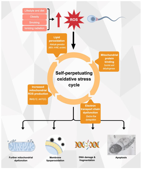 Excessive mitochondrial ROS production is a milestone in the creation of the OS state that underlies male infertility. A crucial trait of this phenomenon is that it establishes a self-perpetuating, vicious cycle in which OS further promotes the generation of excessive ROS generation at a mitochondrial level. This self-perpetuating feature is enabled by the production of aldehydes such as acrolein, malondialdehyde and 4-hydroxynonenal generated by lipid peroxidation, which, in the first instance, carry out an oxidative attack on histidine, lysine and valine residues in mitochondrial proteins, particularly succinate dehydrogenase, an enzyme located in the inner mitochondrial membrane that participates in the ETC [76]. This leads to dysregulation of electron flow along the mitochondrial ETC and further production of ROS, perpetuating the cycle via a positive feedback circuit [54]. In this setting, any factor that breaks the redox balance of the male germ cell inducing OS is prone to trigger mitochondrial ROS generation and begin the previously mentioned cycle. These inducing factors include both exogenous ROS sources (smoking, obesity, radiation, pollution, etc.) and dietary patterns leading to a deficit in exogenous antioxidants (non-enzymatic antioxidants and antioxidant enzyme cofactors).