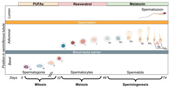 These compounds share a few characteristics that might be relevant to the effectiveness of the regimen: they exert their antioxidant capacities through various mechanisms, many of which overlap. In addition, the three of them have been shown to promote the activity of intrinsic, enzymatic antioxidant systems through the Nrf2 pathway. In the case of PUFAs, the aim of their use during the mitotic phase of spermatogenesis is to generate non-hypoxic preconditioning of male germ cells in order to strengthen their enzymatic antioxidant defences. Moreover, we propose the use of resveratrol during meiosis because of its simultaneous role as direct and indirect antioxidant, aiming to neutralise the possible exogenous ROS before the most vulnerable moment of spermatogenesis: spermiogenesis. Furthermore, melatonin is the antioxidant proposed for the spermiogenesis phase due to the following features: (i) multiple antioxidant capabilities and mitochondrial stabilising properties; (ii) ample distribution throughout the cell given its amphiphilic nature and the proposed active transport at a mitochondrial level; and (iii) prolonged effect due to the analogous actions of its active metabolites. This proposal (graphically presented in Figure 3) intends to take into account the temporality of the spermatogenesis process, albeit in vivo several cycles of spermatogenesis are taking place simultaneously, as previously described.